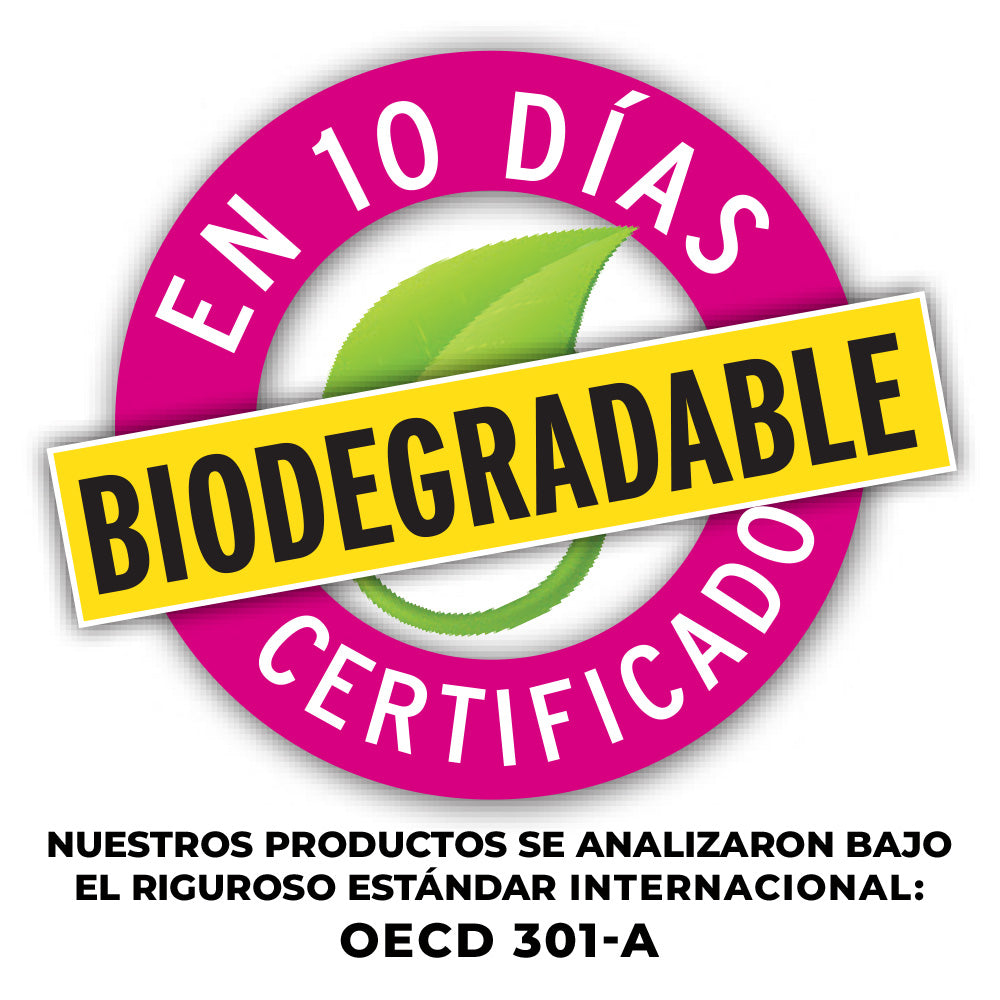 BIODEGRADABLE CERTIFICACIÓN OECD 301-A: Formulado con ingredientes de origen vegetal como coco, palma y aceites esenciales, este detergente líquido para trastes se biodegrada en solo 6 días, cuidando el medio ambiente desde tu cocina.